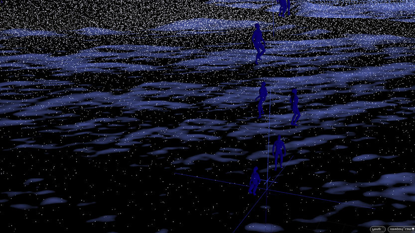 An illusionary, trans-natural scene, archaeological sculpture-like figures, emerging one by one from deep within the earth. Digital-data units uploading heavenward, accumulating till they flood the whole scene, a spreading virus. Heads facing the sky, they are vertically sucked up blindly within a brainwashed herd.
