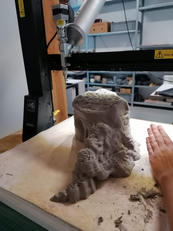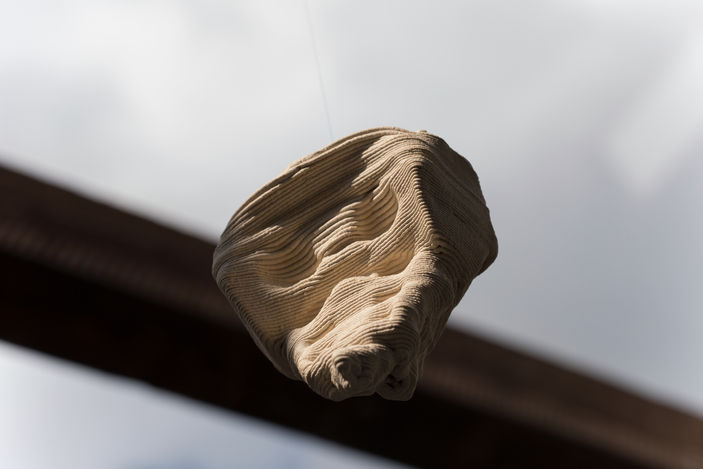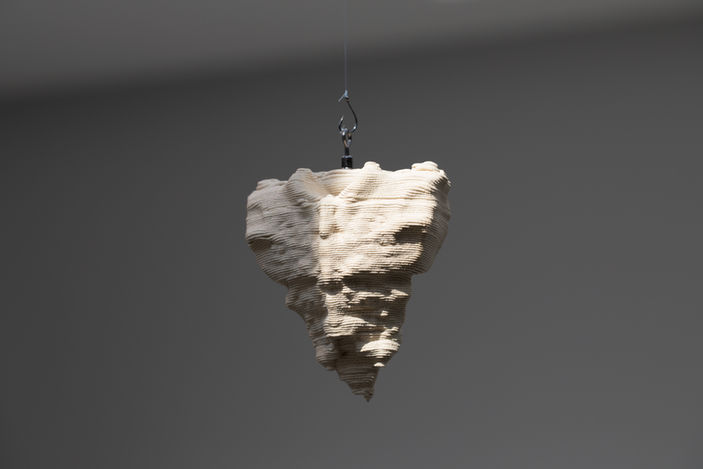 An object, designed for a 3D clay printer to echo the human sacrum bone is hung in the air on a fish hook, turning around itself. Having digitally conceived human facial features, reminiscent of an ancient glorified idol, enfolding in itself a revered sacred object and and at the same time, a victim.